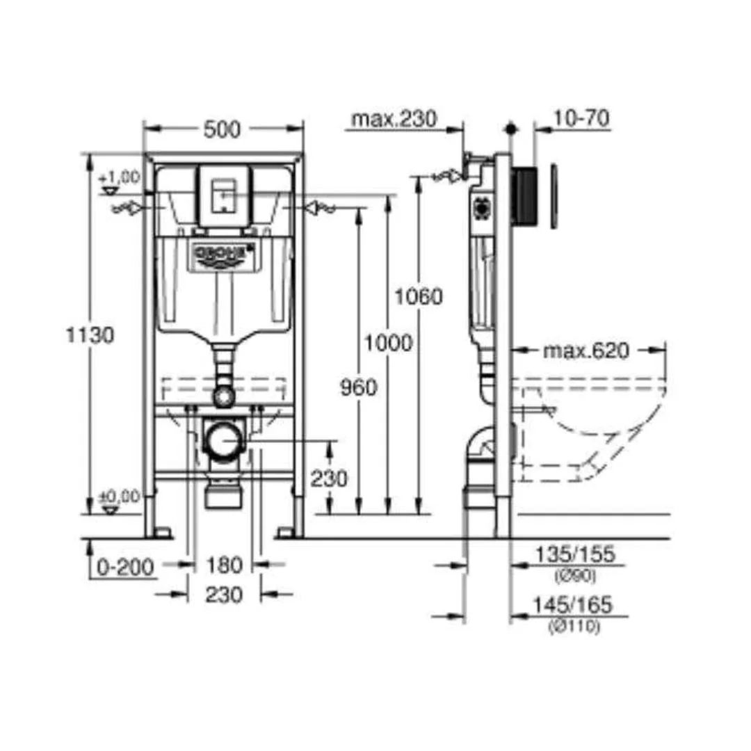 GROHE Rapid SL Installation 1.13m Frame: 4-in-1 set Set Includes: Frame, Wall Brackets & Skate Cosmopolitan White/Chrome Flush Plate Grohe Rapid SL Installation system with low installation height is ideal for under windows. Mounting a wall-hung toilet needn't be daunting with a strong and stable system that is also super-easy to fit. The GROHE Rapid SL 4-in-1 installation set for wall-hung toilets fits the bill perfectly. The steel frame is certified to hold loads of over 400 kg for ultimate stability and it can be installed in front of a solid wall or inside a stud wall in next-to-no-time thanks to the GROHE QuickFix system, which requires no tools to connect hose, inspection shaft and water supply. With a low height of only 82cm, this system can even be installed under windows. The GROHE EcoJoy dual flush system is kinder to the environment, reducing water consumption by up to 50%. Noise transmission to the building is kept to a minimum thanks to GROHE Whisper technology, engineered with low-noise fittings and separate plumbing. Technical Details Grohe Rapid SL 1.13m Installation Frame Flushing Cistern 6:3L Hold loads of over 400 kg Compatible with solid wall or stud walls Set Includes: Rapid SL Installation Frame Skate Cosmopolitan flush plate- White Rapid SL Front Wall Brackets Noise protection